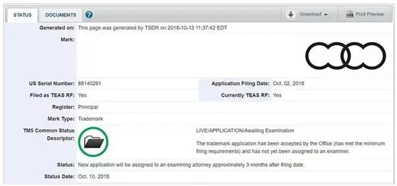 目前可以在美國(guó)專(zhuān)利商標(biāo)局網(wǎng)站查詢(xún)到,奧迪公司確實(shí)在今年10月2號(hào)向此網(wǎng)站提交了新的商標(biāo)注冊(cè)申請(qǐng),根據(jù)申請(qǐng)的信息顯示,奧迪在目前的四環(huán)標(biāo)志的基礎(chǔ)上,重新改造設(shè)計(jì)了兩款新logo,其中一個(gè)看起來(lái)像是在目前使用的四環(huán)標(biāo)志的外部輪廓截取演變成 “一環(huán)”標(biāo)志,而另一個(gè)則是將目前的”四環(huán)“相扣換成了圖中的”兩環(huán)“相扣。